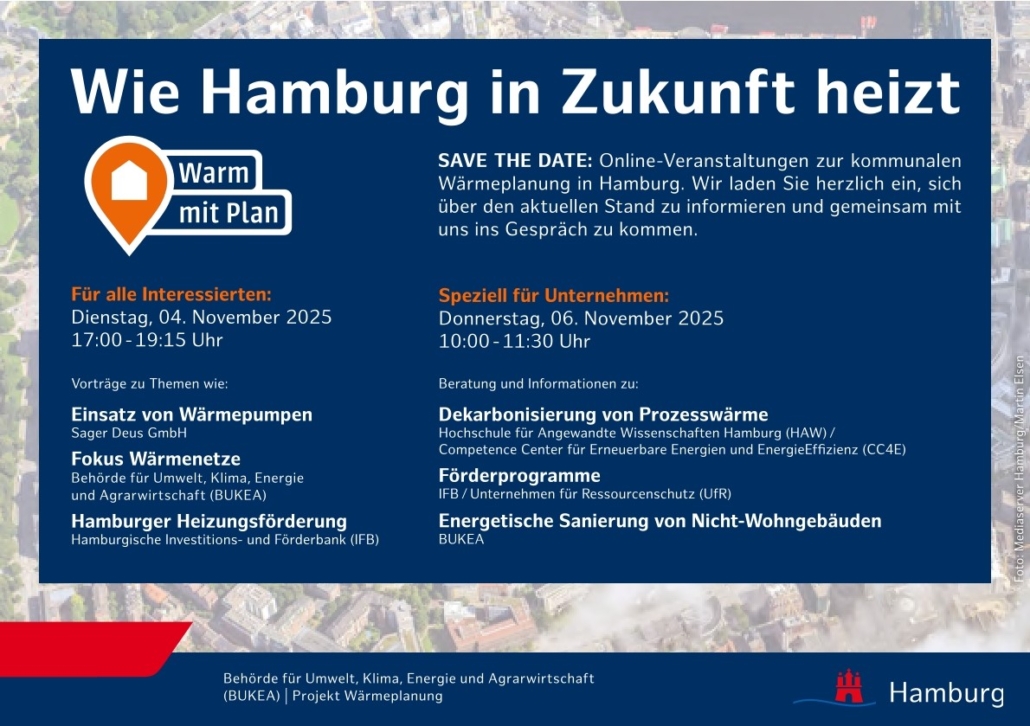 Die Behörde für Umwelt, Klima, Energie und Agrarwirtschaft lädt ein zu einer Online-Veranstaltung zum Thema Wärmeplanung in Hamburg am: